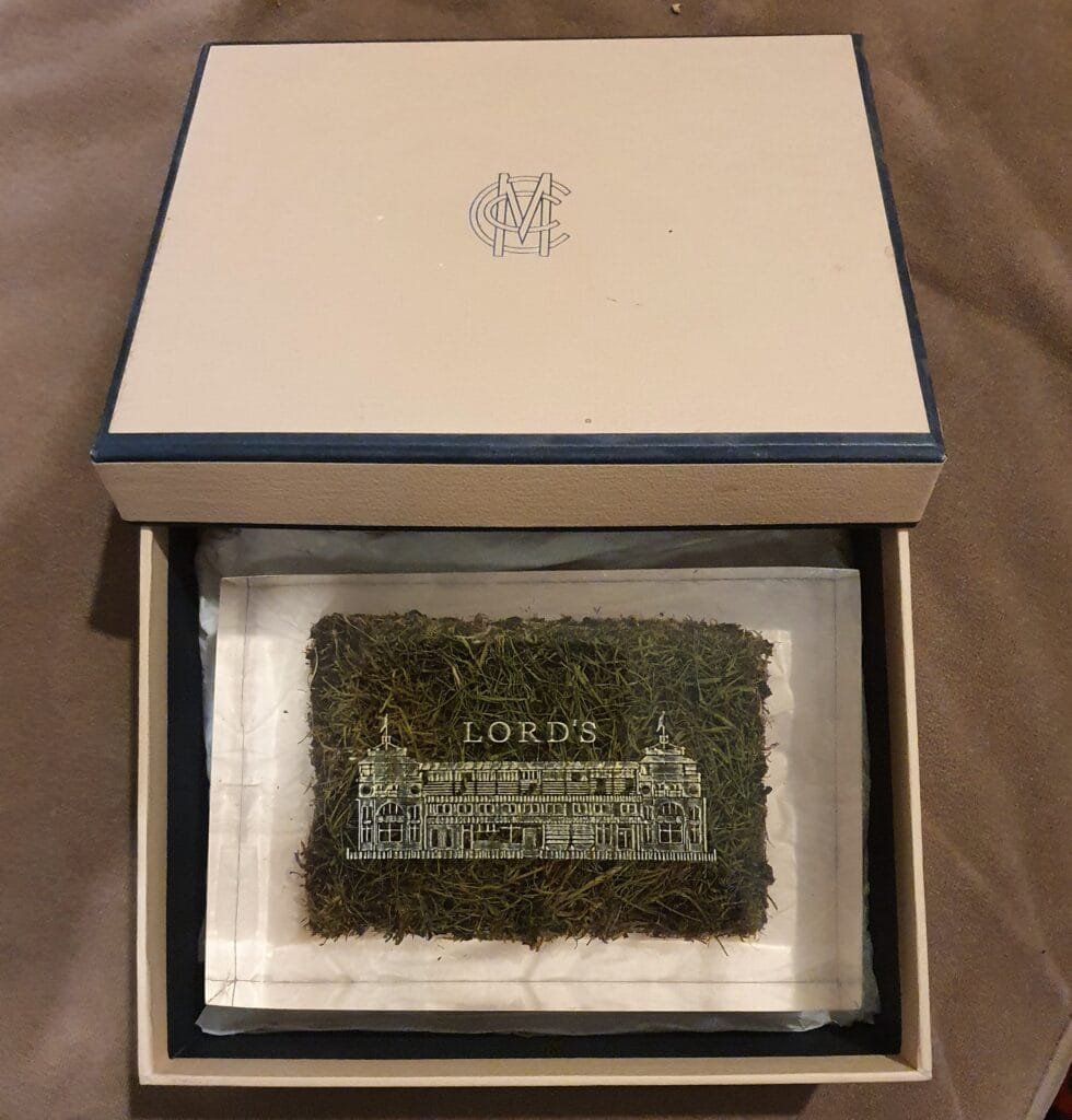 CMS Members will recall receiving an email recently asking for help in finding a suitable Lord’s-related gift. The cavalry surging over the hill appeared in the guise of CMS Member Andy Collier, who not only offered the Lord’s Turf sample pictured here, but generously donated proceeds to the Alzheimer’s Society.